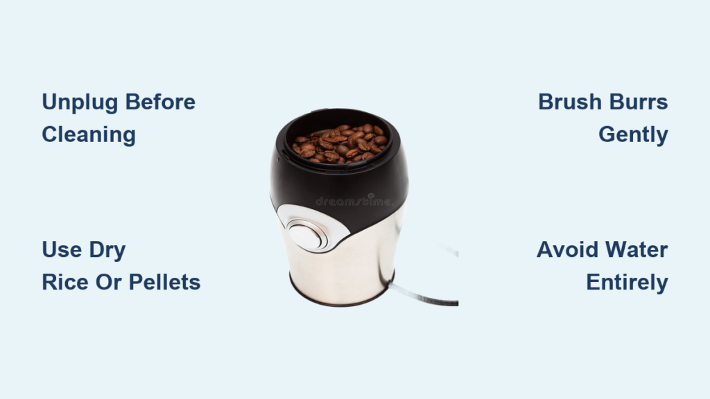 Many online tutorials incorrectly recommend wiping with damp cloths. Even minimal moisture causes immediate damage to internal components and creates perfect conditions for mold growth in hidden crevices. The only exception is certain commercial grinders with stainless steel components explicitly rated for wet cleaning—but these are rare in home models.