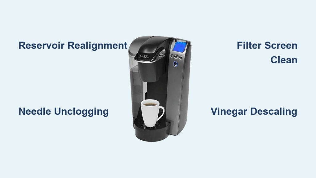 Three specific failures cause 95% of “Prime” errors in older Keurig units. Mineral deposits from tap water create blockages in microscopic water passages—especially problematic in hard water areas where calcium accumulates 3x faster. Coffee grounds and brewing debris clog the needle mechanism that punctures K-cups, restricting flow within weeks of regular use. Reservoir misalignment prevents the water sensor from detecting the tank, a common issue when users refill without proper reseating.
