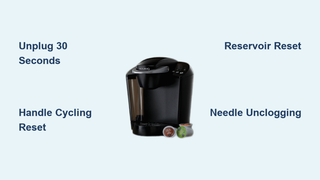 2. Remove any partial K-cup before resetting. Trapped pods cause persistent clogs that mimic power failures.