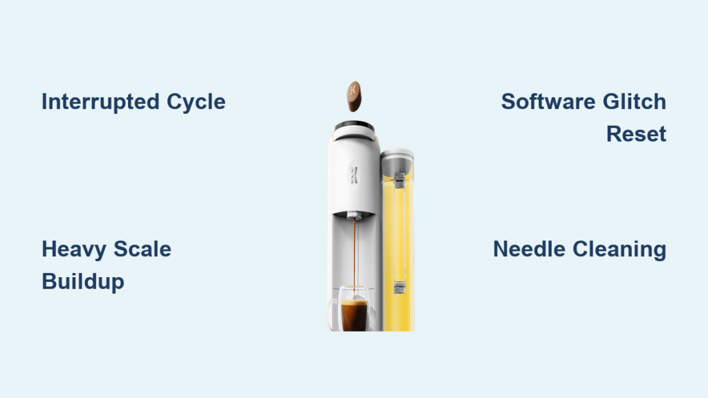 Lifting the handle or power cycling during descaling immediately cancels the process on newer models. These machines have strict compliance tracking—if you interrupted even once, the descale light stays lit until you complete an uninterrupted cycle. Check for accidental handle bumps during the process. To fix this, restart the entire descaling protocol from step one without touching the handle. Never open the pod compartment until the “Add Water” light appears.
