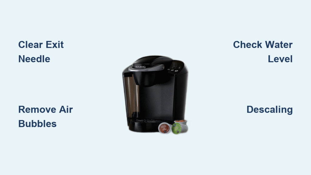 Your Keurig’s exit needle—the sharp metal spike above the K-Cup holder—gets clogged by coffee grounds, tea particles, or cocoa mix within weeks of regular use. When this happens, the needle can’t properly puncture the K-Cup lid or release brewed coffee, causing sudden volume drops. You’ll notice intermittent sputtering, weak streams, or complete brew stoppages before reaching your selected cup size.