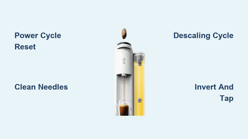 The single exit needle inside the pod holder is equally prone to blockages that cause continuous pumping. Remove the entire pod assembly by lifting the handle and pulling straight out. Flip it upside down to reveal the needle channel. Insert your paperclip vertically into the opening, rotating clockwise while slowly pushing until you feel the tip clear the blockage. Rinse thoroughly under warm running water while squeezing the assembly—water should gush freely through both ends. Reinstall and test immediately; if water still dribbles slowly, repeat the process. This step alone fixes 30% of persistent cases where power cycling failed.