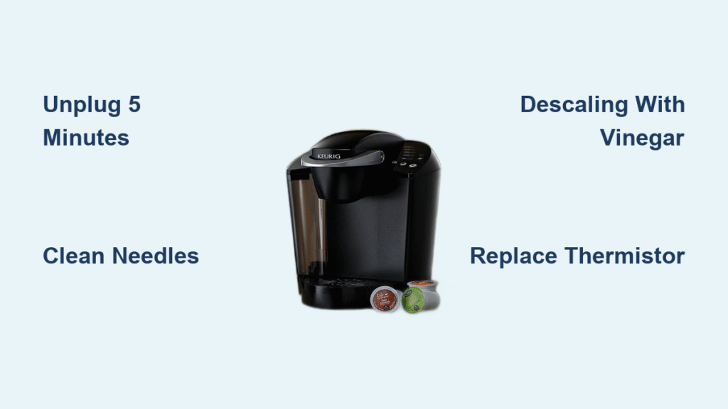 Your Keurig shouldn’t leave blisters. If the top panel burns your fingers during brewing, your machine cuts power mid-cycle, or coffee tastes like charcoal, you’re facing dangerous overheating. These issues stem from mineral scale choking the heater, clogged needles trapping pressure, or failing sensors—and they’ll destroy your brewer within weeks if ignored. This guide delivers proven keurig overheating fix solutions that work immediately, from emergency resets to sensor replacements. You’ll restore safe brewing temperatures using only household items or $8 replacement parts.
