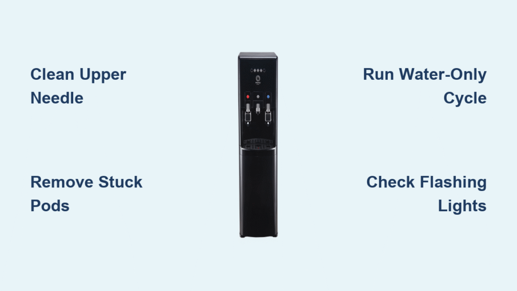 Coffee residue from abandoned pods creates the primary failure point for your Primo dispenser’s Keurig function. When users leave used pods in the brewer drawer for extended periods, grounds migrate into the upper needle’s piercing mechanism. This needle must remain completely clear to inject hot water into Keurig pods—any obstruction stops water flow entirely. You can confirm this specific failure by running a water-only cycle: if the three green lights flash without a pod installed, you’ve verified an upper needle blockage rather than pod-related issues. This distinction is critical because 95% of primo water dispenser keurig not working cases stem from this single clog point.
